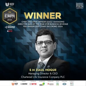 অসাধারণ বাণিজ্যিক সাফল্যের জন্য ‘বাংলাদেশ সি-স্যুট অ্যাওয়ার্ডস’ অর্জন করেছেন দেশের বীমা খাতের চতুর্থ প্রজন্মের কোম্পানি চার্টার্ড লাইফ ইন্স্যুরেন্সের মুখ্য নির্বাহী কর্মকর্তা (সিইও) এস এম জিয়াউল হক। বর্ষসেরা প্রধান নির্বাহী ক্যাটাগরিতে (যাদের বার্ষিক ব্যবসায়িক আয় একশ’ কোটির মধ্যে ছিল ) তাকে এই পদক দেয়া হয়।
